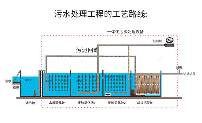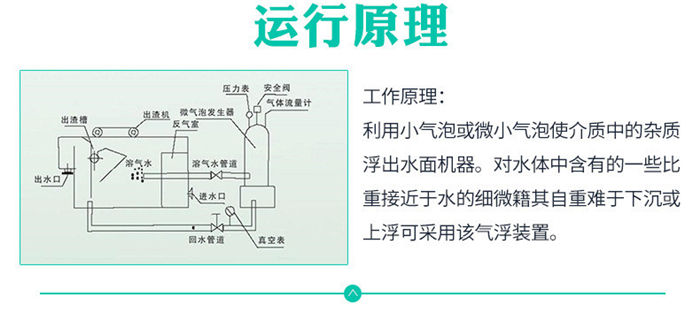 污水經絮凝反應后進入混合區,與溶氣水混合接觸。絮體與溶氣水中的小氣泡相互粘合,然后進入氣浮區,并隨小氣泡一同浮到水面,形成浮渣。下層的清水經集水器流至清水池后,一部分回流作溶氣水,剩余清水通過溢流口流出。氣浮池上面的浮渣由刮板刮至污泥池并排出。
