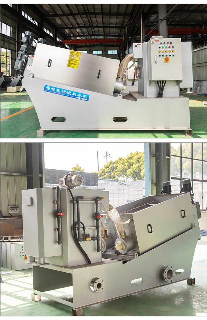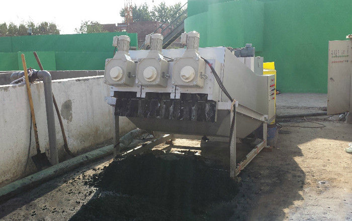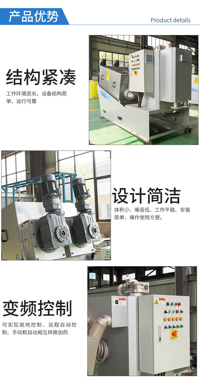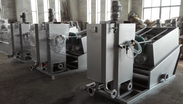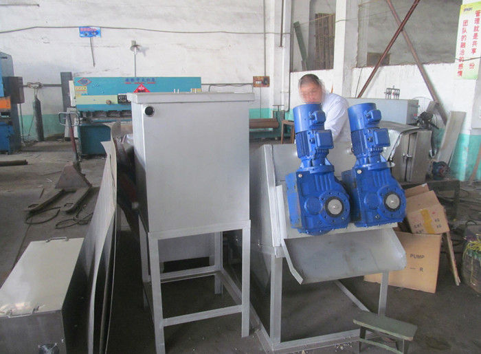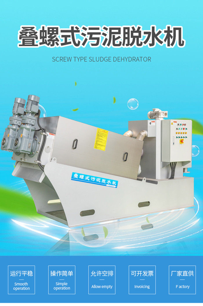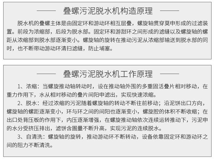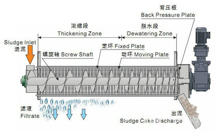 污泥通過泵,輸送至污泥槽,流至混合槽內,同時絮凝劑由加藥泵送至槽內,混合槽由液位控制,防止滿溢。攪拌混合形成泛花,理想泛花象棉花狀,一朵朵的,然后流至過濾機,液體透過動片與定片的間隙流出,固體通過螺旋旋轉不斷向前,在出口壓板的作用下充分脫水,至出口。
